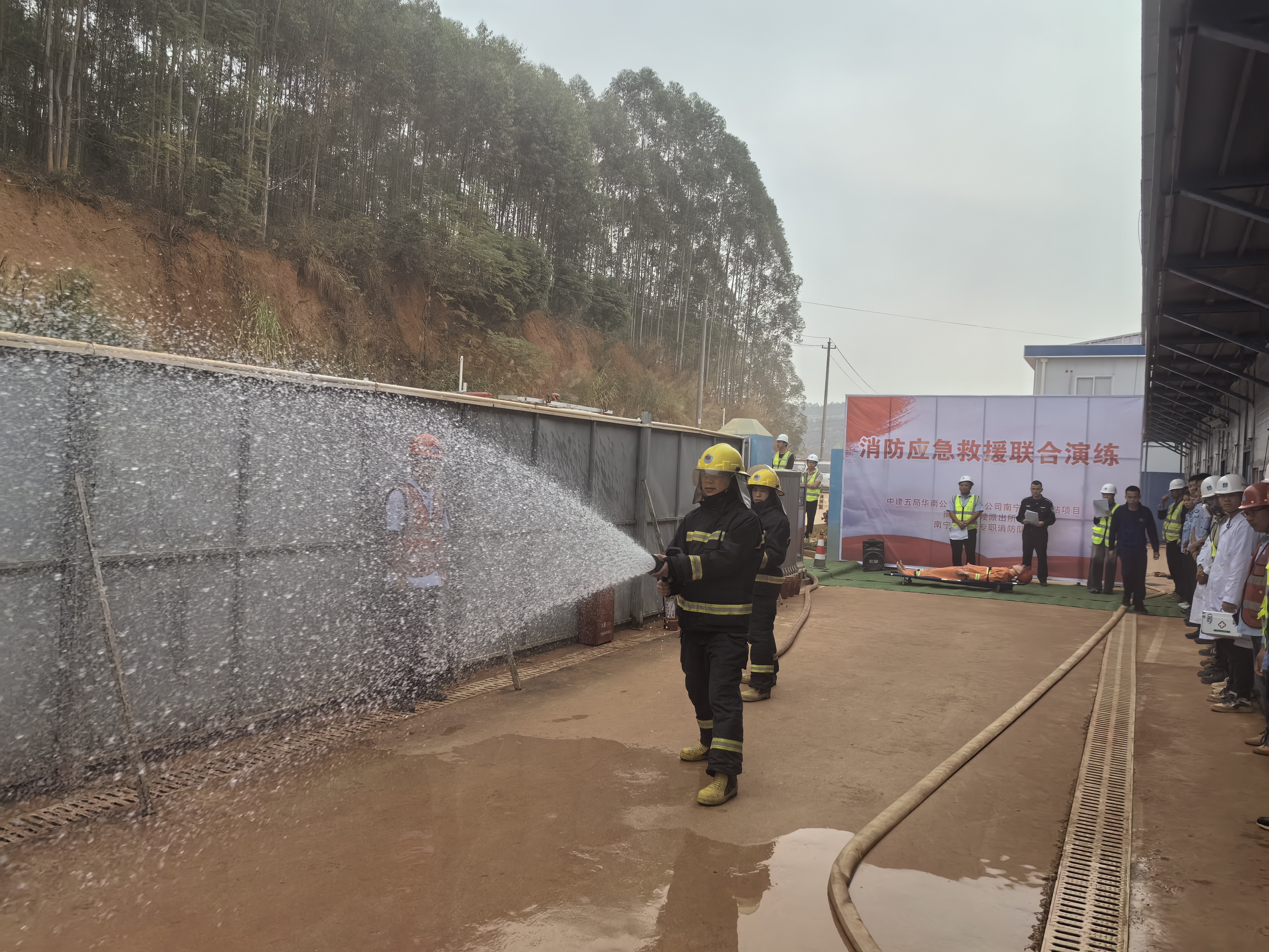 本次消防演練模擬的場景為工人生活區(qū)板房突發(fā)大火,有1名工人被困,項目部即刻啟動消防緊急預案,設置警戒疏散組、應急救援組、通訊聯(lián)絡組和醫(yī)療救護組,派出所工作人員配合協(xié)調開展“滅火”工作,消防隊將消防車駛入現(xiàn)場工人生活區(qū),啟動消防車水泵的救援全過程。
